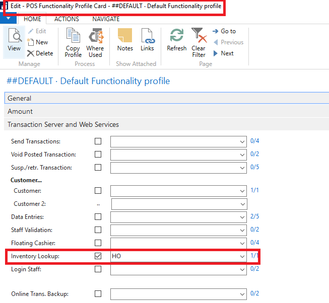 5. Go to the functionality profile which is mentioned in store, move to the Transaction server and web services TAB . Put HO in the Inventory lookup field. This way store database would know from where the inventory information would be pulled from.